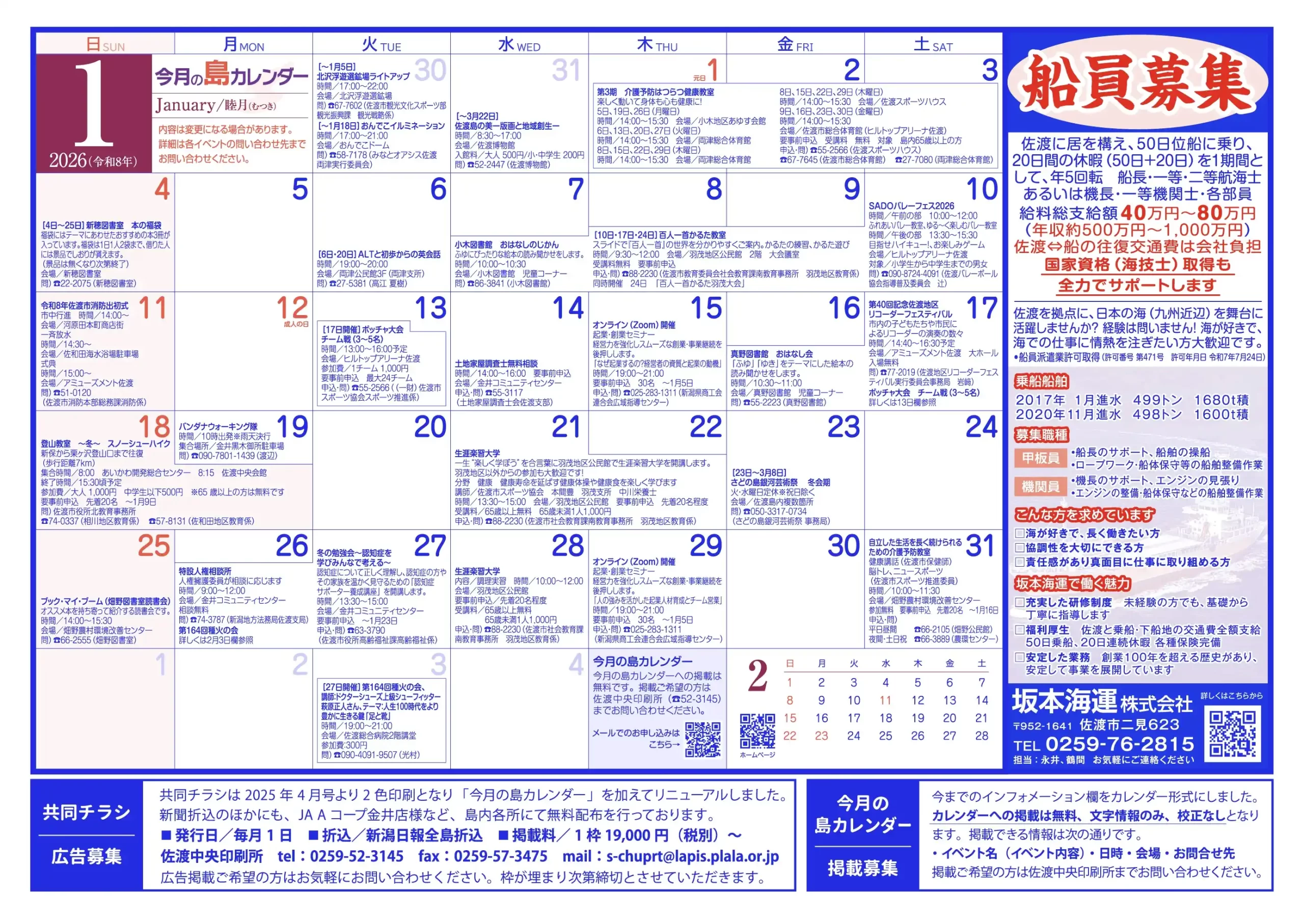 2026年 共同チラシ1月1日号 今月の島カレンダー